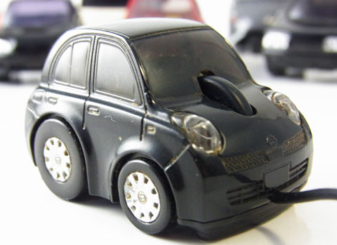 そう、こんな姿だがコイツはUSBマウスだ。フロントウィンドウを突き破った黒い物体はスクロールホイールで押し込み動作にも対応、左右のヘッドライトがクリックボタンとなる。確かにヘッドライトをクリックボタンとするギミックなら、可愛らしい出っ張ったヘッドライトを持つK12マーチは適任だろう。