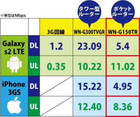 なお、iPhone3GSは3G回線に繋がっていないため3G回線は測定していません。