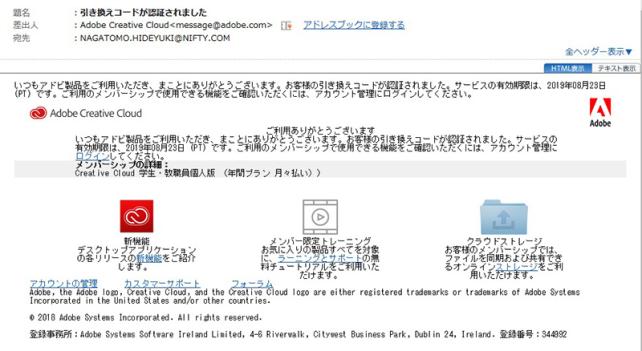 昨年は、オンラインで受講を申し込むと、1週間程で受講関連の書類と一緒にライセンスカードが届き、adobeサイトで契約を更新していたのですが、今年は、オンラインで受講を申し込み、カード決済を行うと、直ぐにメールが届き、そこにサブスクリプション契約の入力用シリアルコードが記載されていました。
