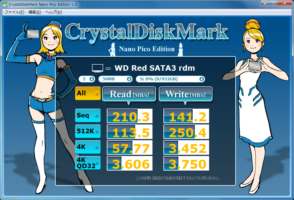 続いてSATA3での確認。50MB、100MB、1000MBで行いました。