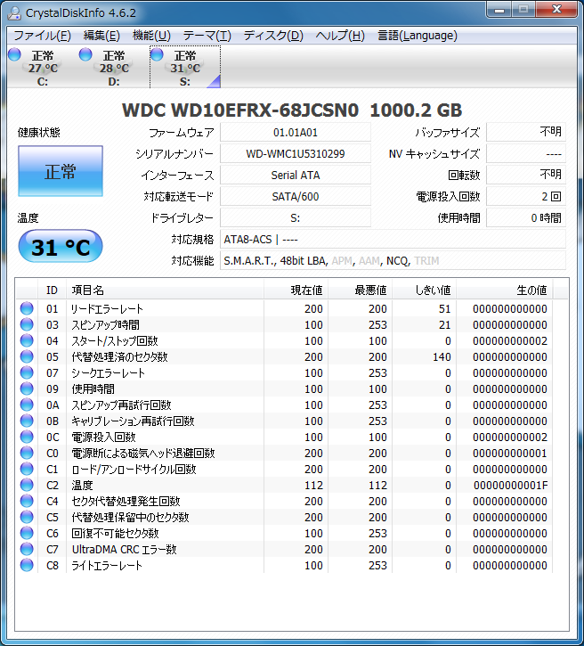 次に、CrystalDiskInfoの情報。バッファサイズや回転数は不明と表示れます。