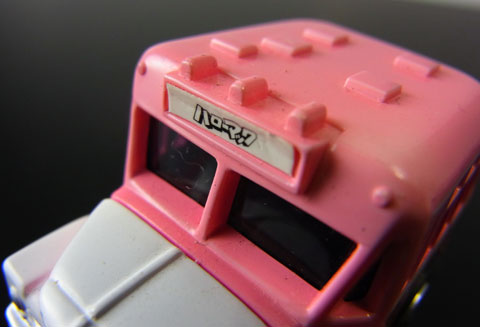 ピンクとホワイトのツートンカラーに、フロントグリル&リアランプは塗装。それ以外の「ハローマック」分はステッカーというカタチになっている。