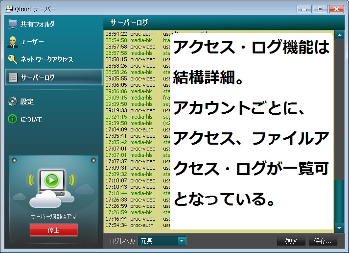 アクセスログも取れる。TXT保存機能あり。