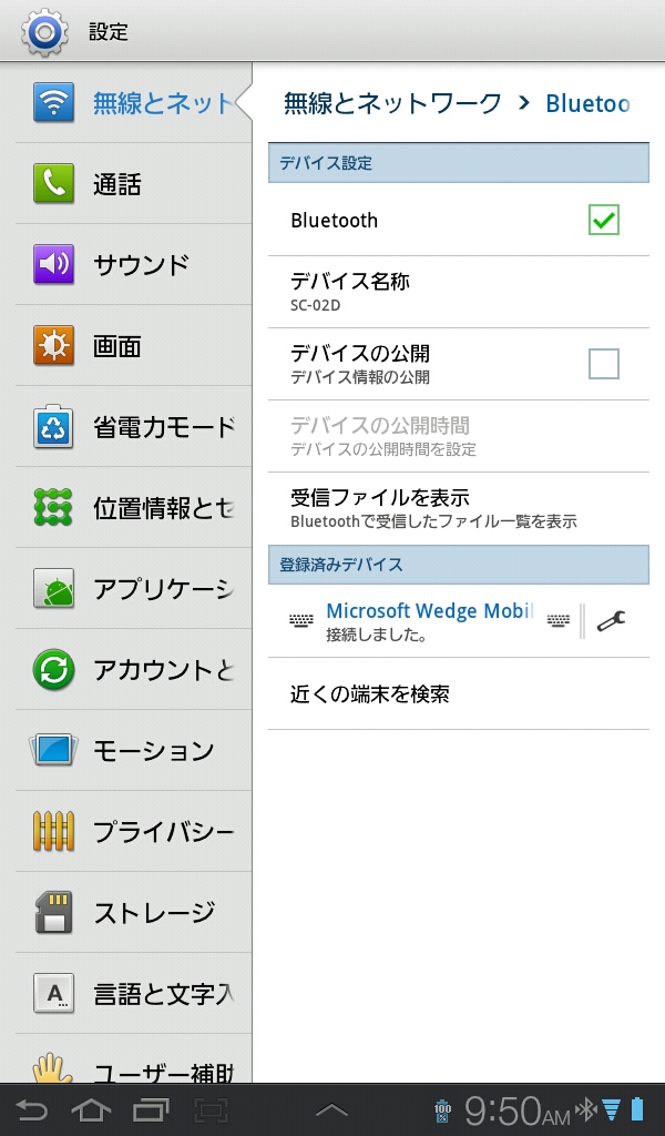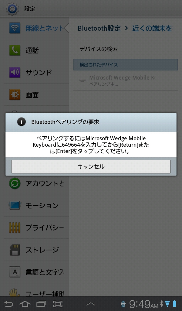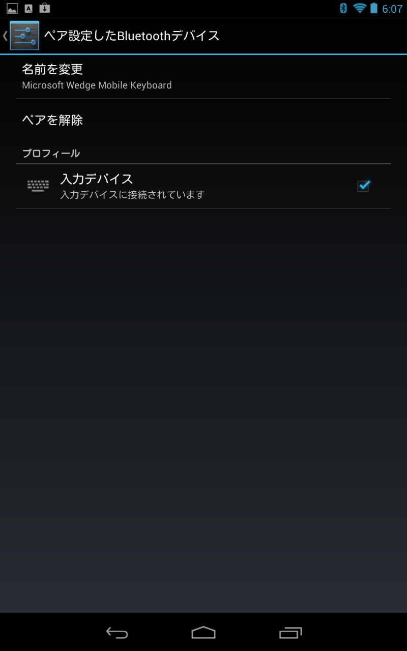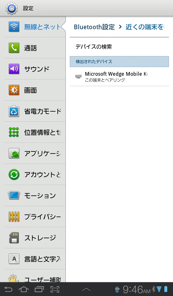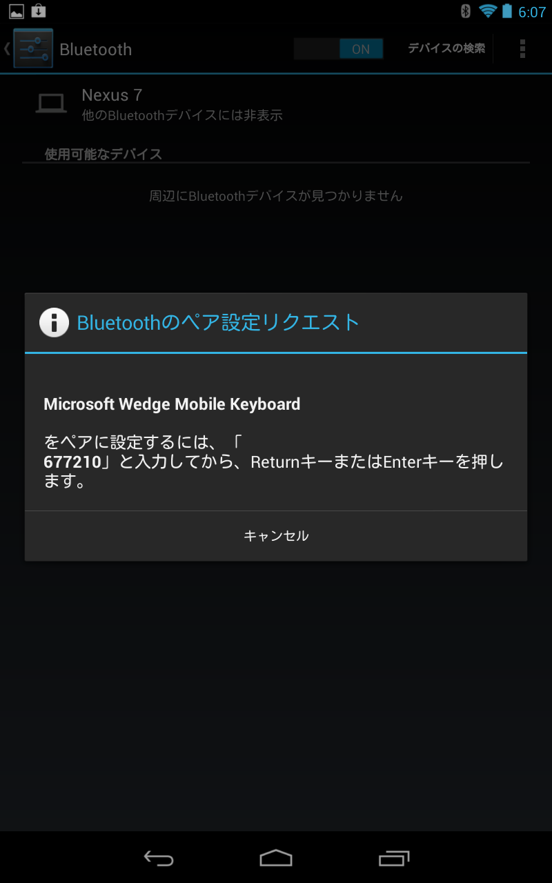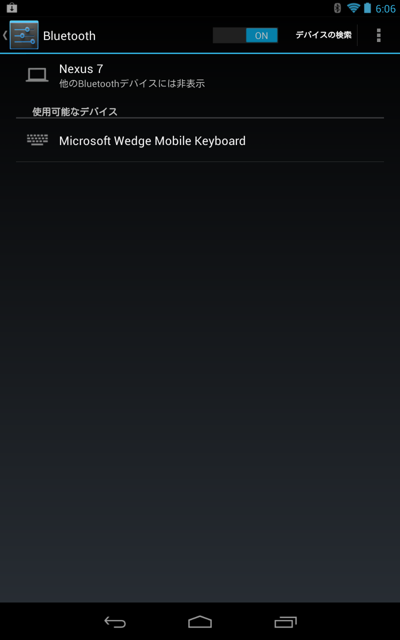 タブレット(Google Nexus 7)側で、設定→Bluetoothでデバイスを検索して選択します。
