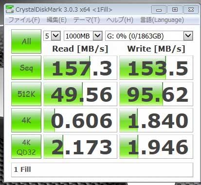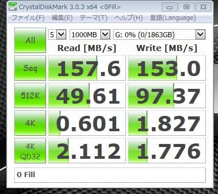 速度的にもシーケンシャルリードは、SATA2で接続している古いPCなので、157MB/sも出ていれば、SSDを入れた場合と比べても100MB/s程度しか変わらないので大満足。