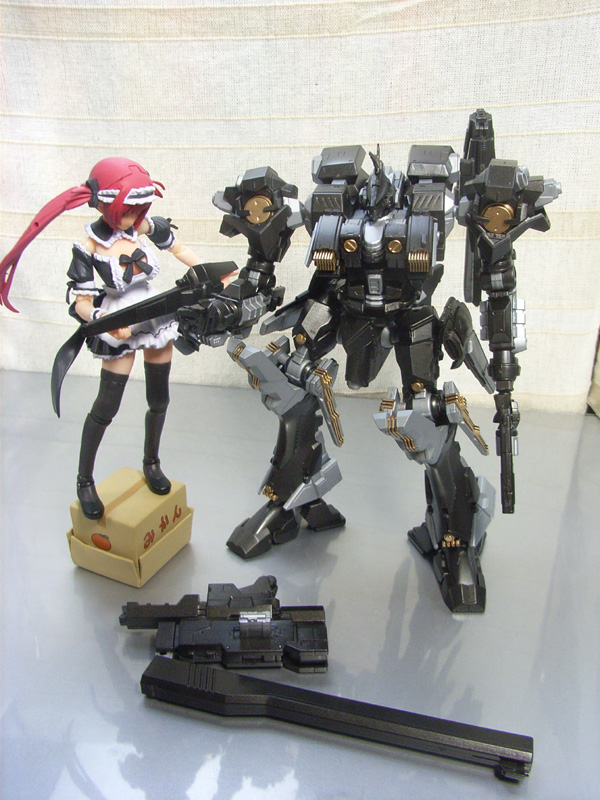 オプションパーツとはいえ小さなハンドガン入りで2個だけかよと思ってしまうが、スナイパーキャノンのでかさは予想以上。確かにゲーム中でも長い長いと思っていたが、実際組み立ててACに搭載した時のインパクトは大きい。というか展開時にバランス取るのが難しい。