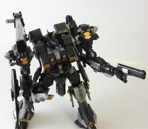 アーマードコアシリーズは両腕両肩の4箇所+αに武装を搭載できるが、キット単体ではレーザーライフル&キャノンだけという弾切れ必須漢装備なローゼンタール オーギルガンメタVer用に購入。装着前の写真を撮っていなかったので全てモデル込みの写真なのはご了承を。