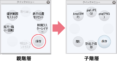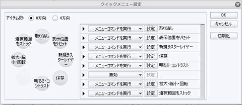 こちらは、Intuos5の「ラジアルメニュー」のようなもので、作業中の画面上に、登録しておいたメニューが表示されて使用できるものです。