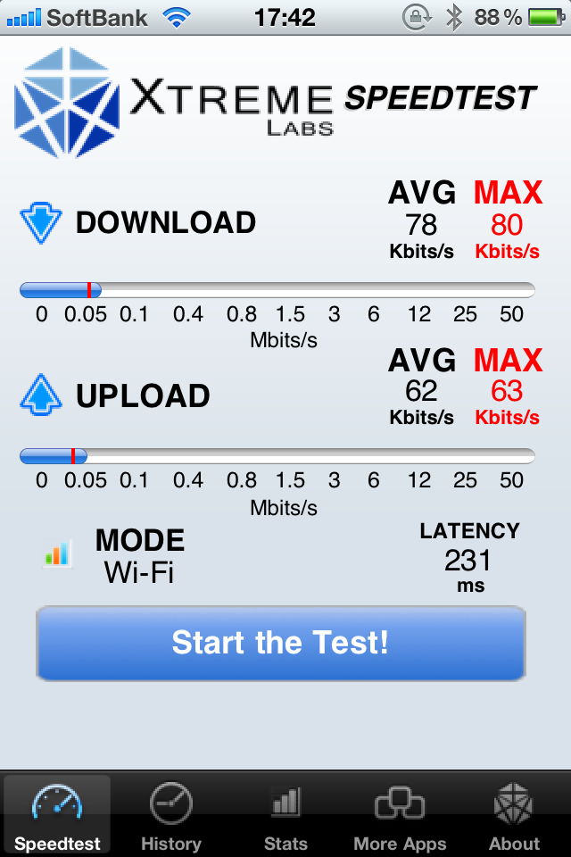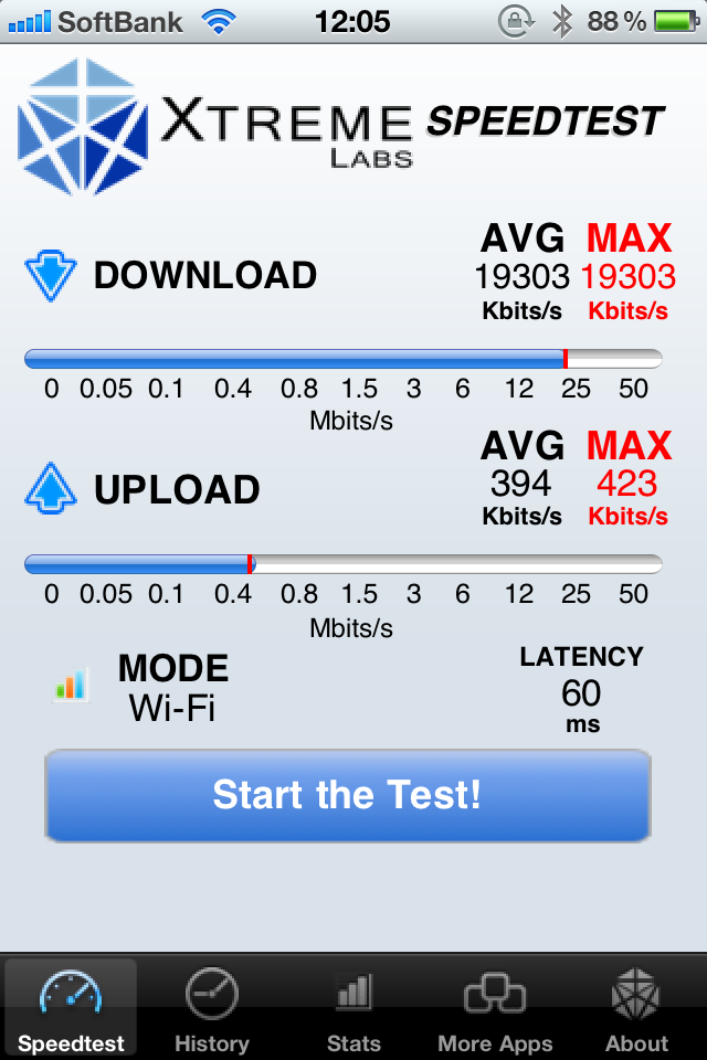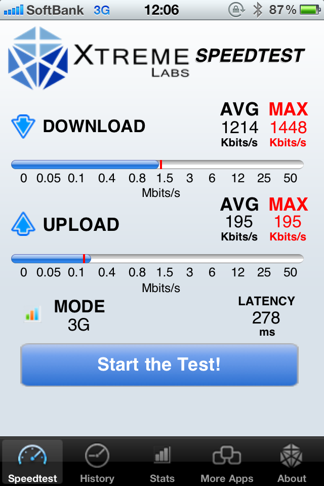 XTREAM LABS SPEEDTESTは、iOS用のスピード測定ソフトでは、低めに出るような気がします。