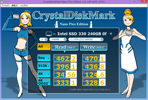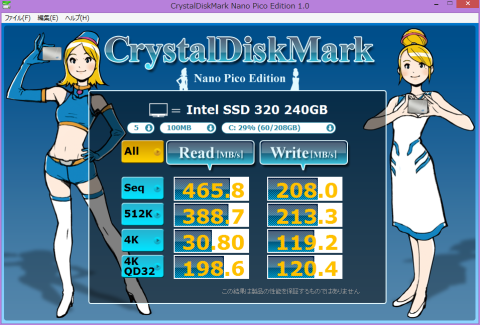 ランダムデータでのスコアはリードは465MB/s、ライトはデータ圧縮の関係で208MB/sという結果に。性能的には後継モデルのSSD 335 240GBと同等です。