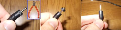 ② ニッパ-で切断箇所を押上、プラグから引きぬく。