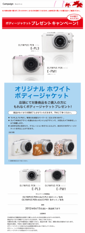 OLYMPUS PEN Lite E-PL3 または、PEN mini E-PM1 を購入すると、店頭でもらえるオリジナルホワイトボディジャケットです。