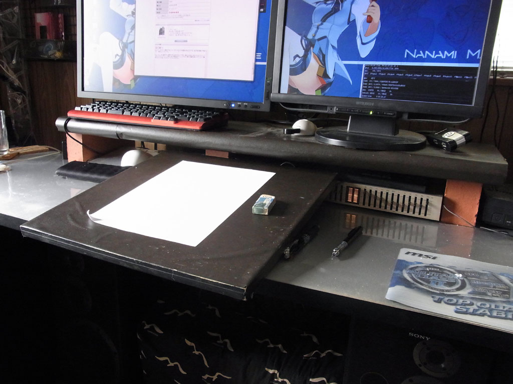 更にこんな感じでキーボードどかしたところに傾斜作業台…といっても不要になった棚の側面版に壊れたHDDで作った土台を置いてるだけのこれまた廃品利用な台おいて使ったりします。