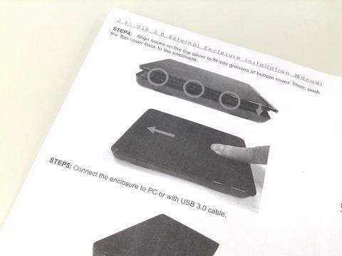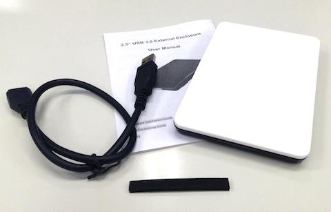 パッケージ内容は「ケース本体」「USB 3.0ケーブル」「スポンジ(ゴム?)」「英語の取扱説明書」の4点です。取扱説明書が英語のみという時点で日本向けの商品じゃないなと思いましたが、必要なことは箱に書いてあるようなので、取扱説明書が日本語でなくても何とかなりそうです。
