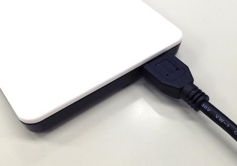 本体の背面側にUSB 3.0のソケット(タイプB)が付いていますので、そこに付属のUSB 3.0ケーブルを挿し、PC側のUSB 3.0ポートに接続すれば直ぐに使えるようになります。