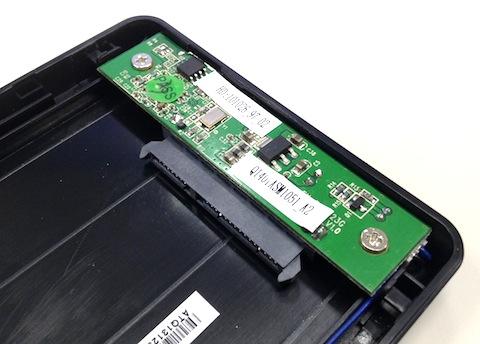 本製品は2.5" SATA用なので、厚さ10mmまでのHDDやSSDが取付けられます。取付は簡単で、HDDやSSDのコネクターの向きを合わせて少し斜めの角度から挿入します。