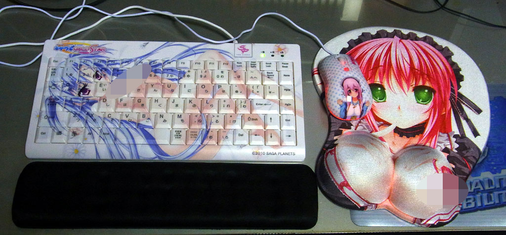 という訳で、SAGA PLANETSのPC用ゲーム「キサラギ GOLD★STAR」のキャラクター羽音々翼(はとねつばさ)のイラストがプリントされたキーボード…なのだが、そのイラストが一糸纏わぬ姿であるが故に、 「R」キーとか「5」キーに意味深な修正を入れないとZigsowに掲載さえできない恐ろしい破壊力のキーボード。2枚目の配列写真はわざわざ隠したキーの文字いれるはめに!(無駄な努力