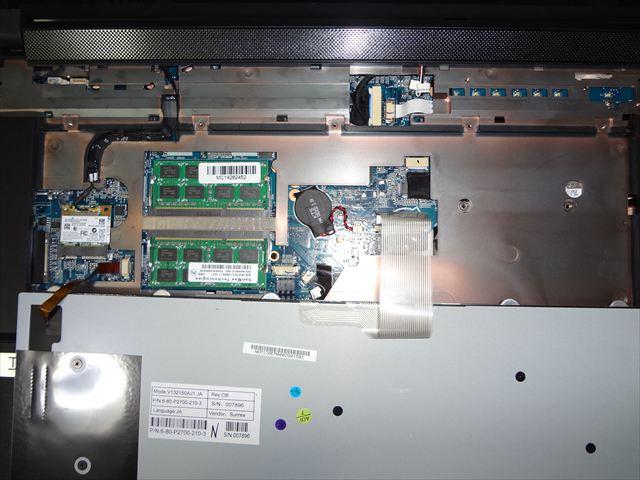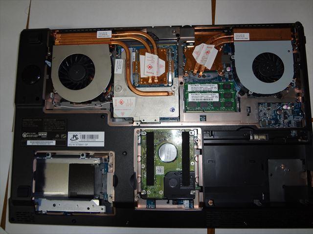 裏の蓋を開けたところです。目に見えるネジを外すだけで比較的簡単に外せるようになっていて、各デバイスにアクセス出来ます。これはBTOノートパソコンらしい、メンテナンス・拡張しやすい設計なのではないでしょうか。