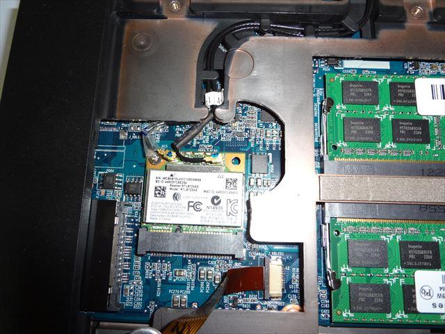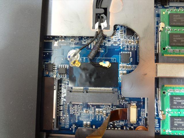 無線LANカードを外した様子。このコネクタ2つで繋がれてるわけですね。外すのはそんなに難しくないです。
