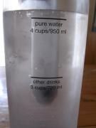 では早速「素の炭酸水」を作ってみることにしましょう。ボトルに水を入れます。ボトルには950mlと720mlのところに線が入っています。水の場合は950ml、その他の液体は720mlと指定されています。これ以上でもこれ以下でも作れません(推奨されていません)。人柱となって自己責任で実験する以外は分量は守った方が無難です。