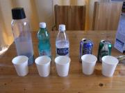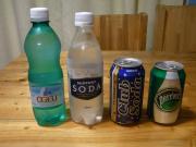 用意するのはクエン酸と重曹(炭酸水素ナトリウム)と水です。重曹は昨今は掃除用としてホームセンターで売られていたりしますが、どんなものが混じっているか分からないので薬局で日本薬局方の炭酸水素ナトリウムを購入してください。500mlのペットボトル2本に250mlずつの水を入れ、それぞれに小さじ1杯のクエン酸と重層を入れて混ぜておきます。片方の液体をもう片方のペットボトルに静かに入れます。反応して二酸化炭素が出ますので、一気に入れると吹きこぼれますので注意してくださいね。たったこれだけで炭酸水の出来上がりです。さあ、一気に飲み干してみましょう・・・う~ん、まずい! そうこの方法では塩ができてしまうし、反応させる物質も正確に測っているわけではないので純粋に水に炭酸ガスが溶けた状態とは異なります。でもこれに砂糖を50~100gいれるとおいしいサイダーになります。そう、市販のサイダー等にはものすごい量の砂糖が入っているのですよ。一度これを作って砂糖を自分で計量すると二度と市販の清涼飲料水などは飲めなくなること請け合いです。砂糖を50g一気に飲んでいる自分を想像したくないですものね。