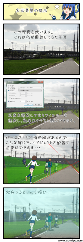 またコミPOには透過コマがあるので、上級者はPhotoshopなどと絡めてアイテムやテクスチャーなどつくって、合成しまくれば、結構いいものができあがると思います。(もちろん手間はかかりますが・・・)