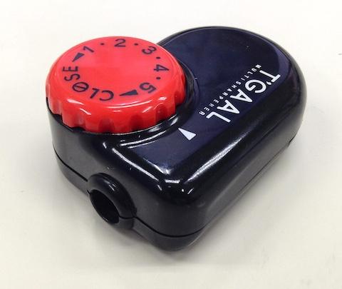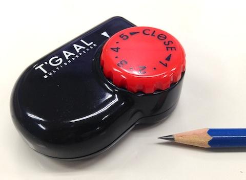 ダイヤルを「CLOSE」位置から「1」あるいは「5」の方向に回すと、ダイヤル外側のカム(半月状)でフタパーツのアームを押して鉛筆を挿入するフタが開きます。