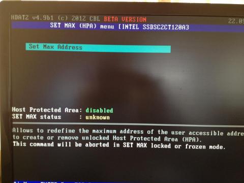 7.表示されたデバイスリストからオーバープロビジョニングの対象となるSSDを選択しEnter、表示される中から「SET MAX (HPA) Menu」をEnterして、次の画面では「Set Max Address」をEnterします。