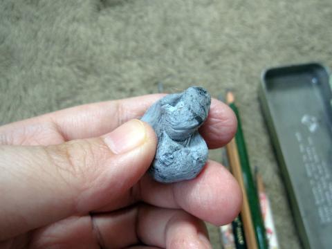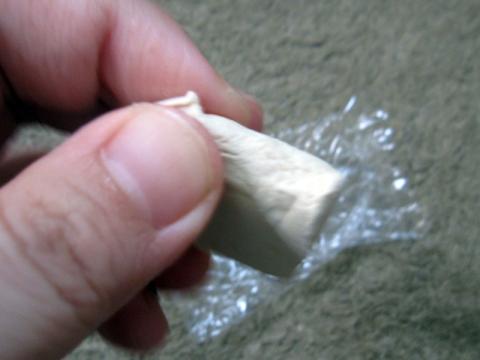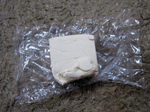 ちぎって使ったまま、その半分が残っています。練るまでは結構硬いです。ゴムではあるので、弾力性はありますが、押しつぶすには結構力が入ります。ちぎって練った側も残っていました。