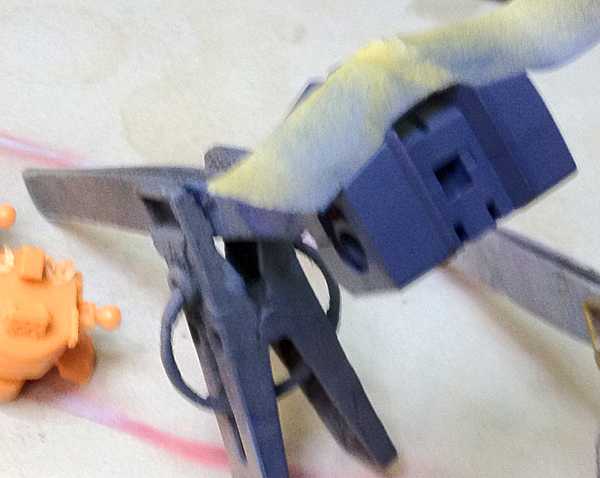 肩の合わせ目は、胸ダクトの赤パーツを挟み込むため、胸ダクトを赤で胸と背中を紺で塗装後に合わせ目処理して、マスキング後に再度紺の塗装をしています。