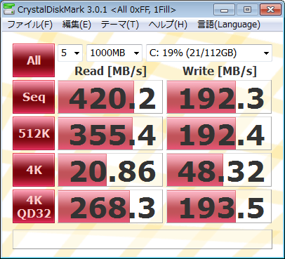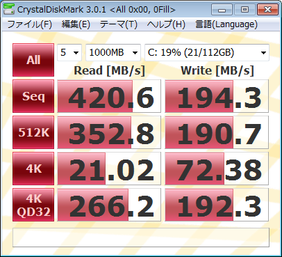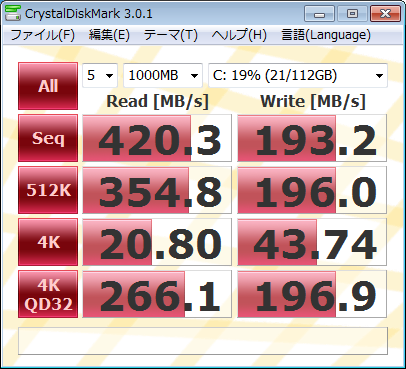昨今のSSD性能合戦を鑑みると、あまり速くはないですね。もっとも、個人的にはシーケンシャルReadWriteの数値よりも4kWriteの数値を気にします。その点は期待してもよさそうです。