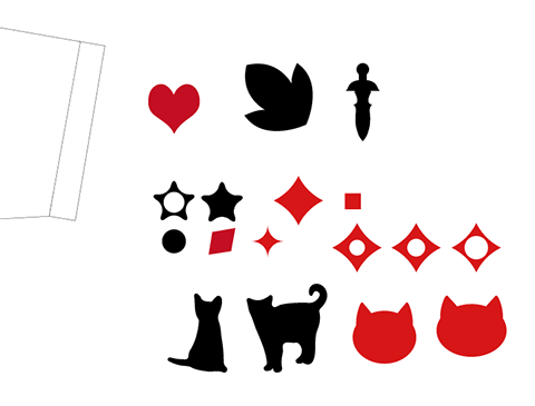 ハート、カエデ、ソード、スター、ダイヤ、素材集からシルエットを抜いてきた猫などなど・・・。