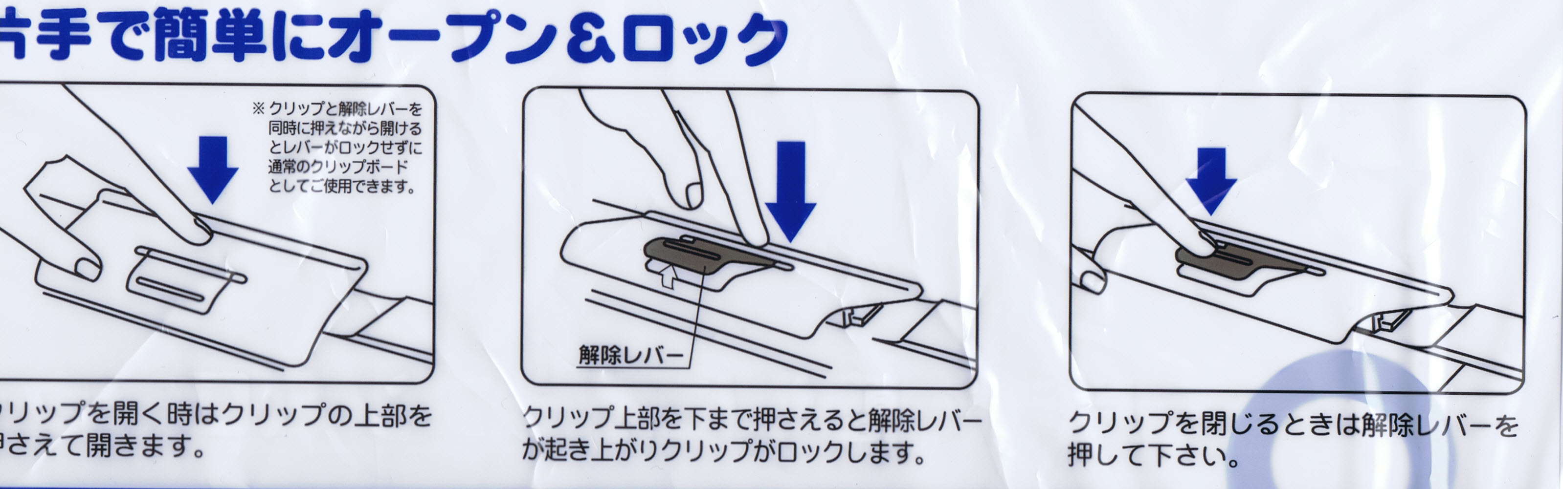 クリップにある 補助レバーを上げると、クリップが開放されたままとまる。