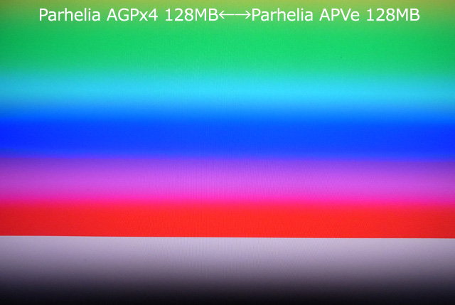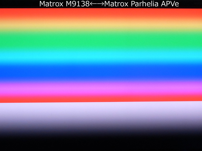 MATROXといえば色!以前ParheliaAPVeで、NEC製モニタの2画面同時入力機能を使ったこんな比較をやっていた。