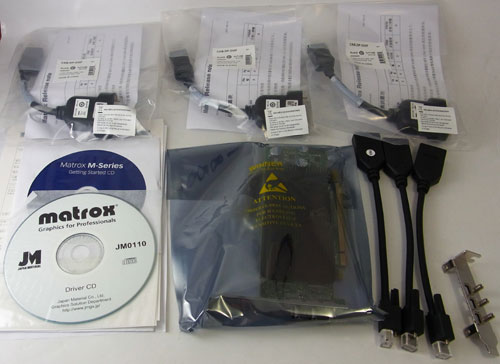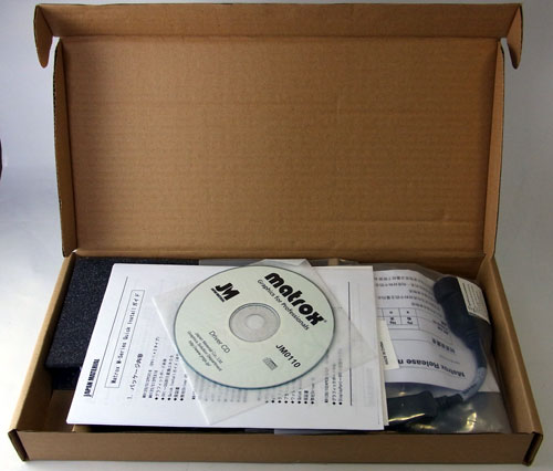 付属品は先述のケーブル2種*3本づつに加えてロープロファイルブラケット、ドライバディスクにマニュアル類と質素。しかもドライバディスク、MATROX側が用意したCD-ROMは公式サイトのドライバダウンロードページにジャンプするだけだ。