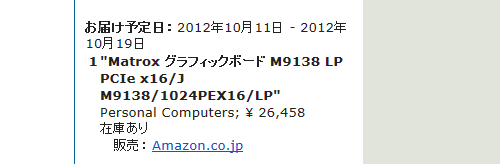 AmazonはたまにMATROXカードの異常な値下げをするのだが、今回のM9138は26500円まで下がっていた。正直意図が読めないのだが、この値下がり階段、誰かが1個買うと元に戻る。