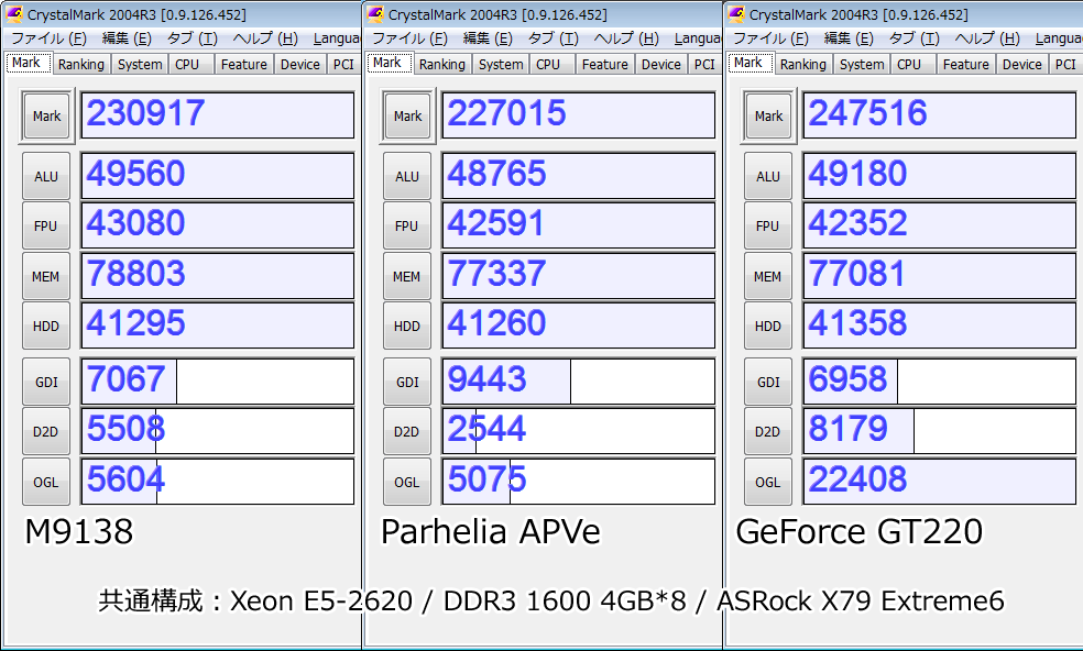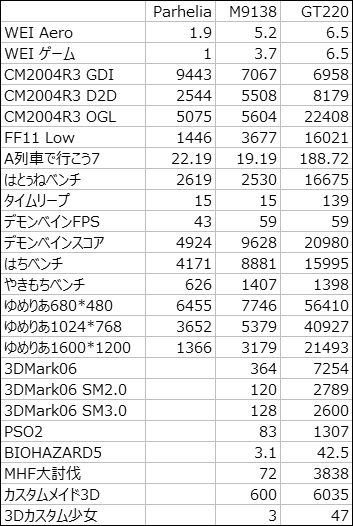 Parheliaの場合起動さえしないベンチが多かったので、M9138になってより「求められる性能の違い」が判りやすくなりましたね。とはいえあくまでDirectX9なのでFF14ベンチなんかはクラッシュしますw