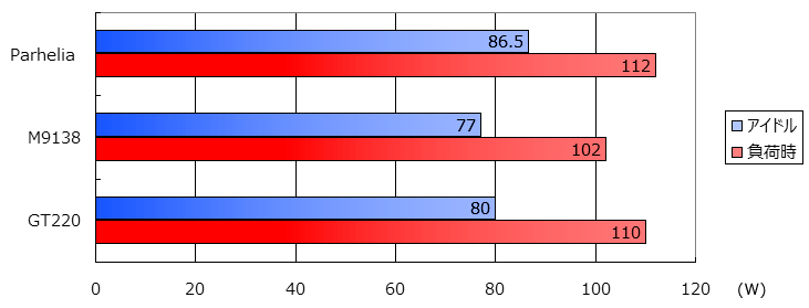 設計の古いParheliaは意外と消費電力が大きく、GeForxeGT220以上だったらしい。一方M9138はファンレス動作も意識してアイドル時・負荷時共に両者より低い。