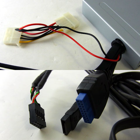 接続はUSB2.0ピンヘッダが2ポート分、USB3.0ピンヘッダも2ポート分、そしてeSATA用のSATAケーブルが1本に給電用ペリフェラル4pinが1つ。どれも58cm程あり長さは十分なのだがペリフェラル4pinのみかなり短めだ。