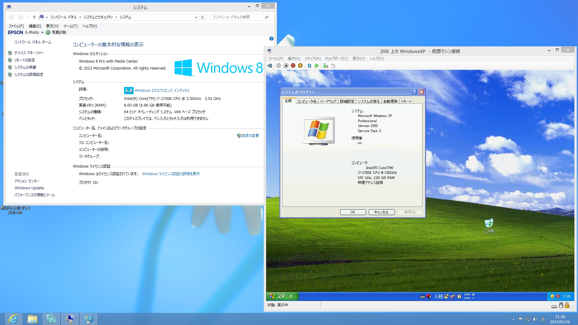Windows8 64bit版をホストに、ゲストOSをWindowsXP 32bit版を構築しました。