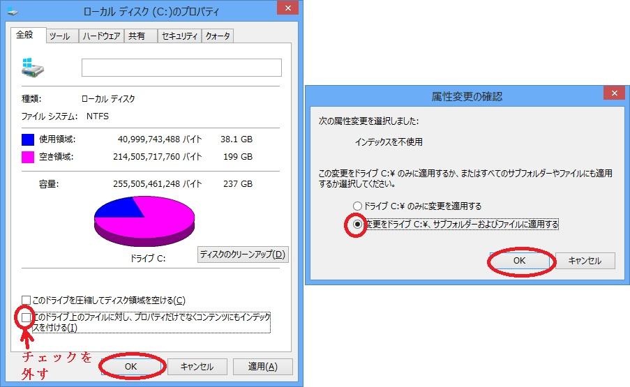 プロパティだけでなく コンテンツにもインデックスを付ける」のチェックを外す →