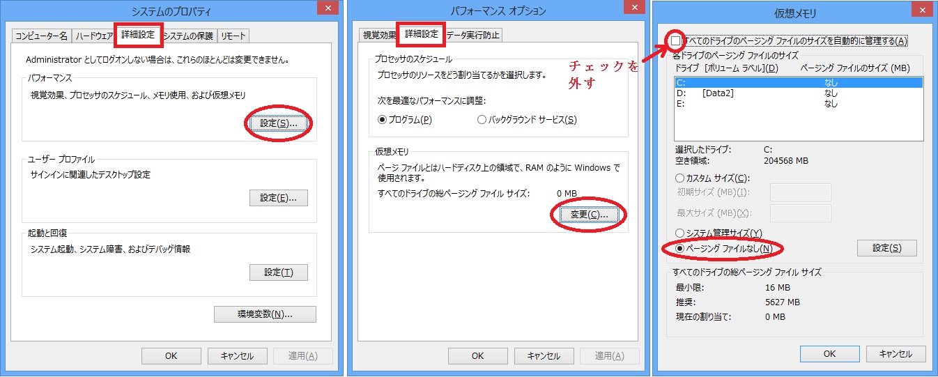 →「仮想メモリ」の変更 → SSDドライブを選択 →