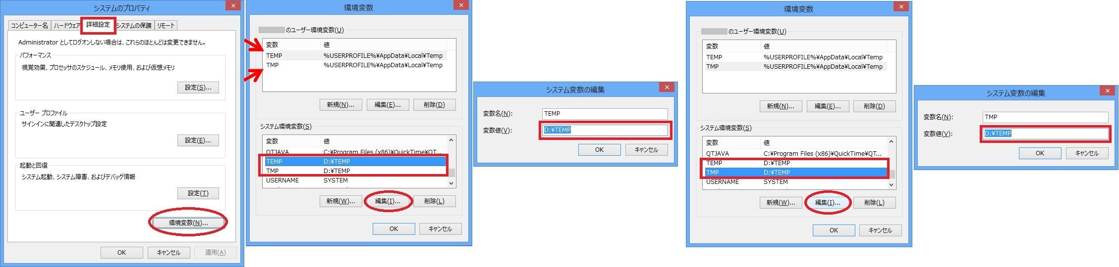 →詳細設定 → 下部の「環境変数」 → ***の環境変数の「TEMP」「TMP」に対し
