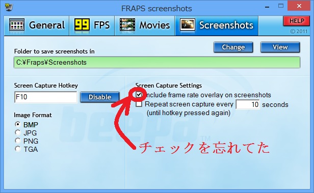 ★【Fraps】「on screenshots」のチェック忘れでした。