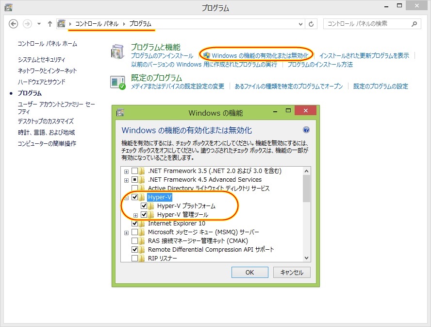 コントロールパネル → プログラム → Windowsの機能の有効化または無効化
