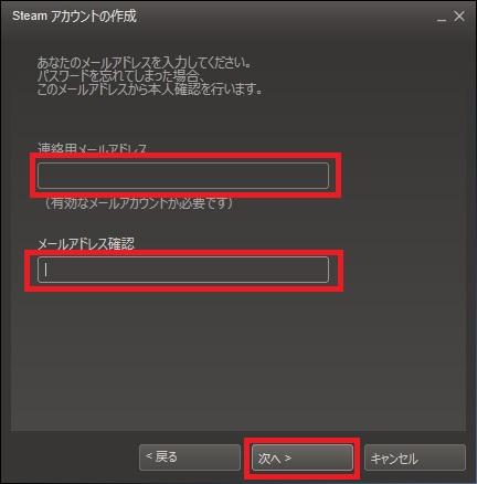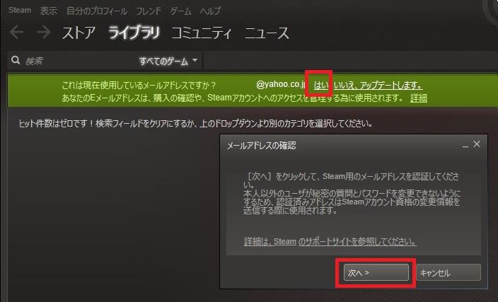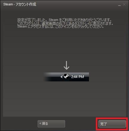 タスクトレイのSteamアイコンを最初にクリックするとメールアドレスの確認画面が表示されます。