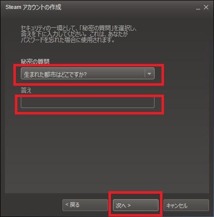 秘密の質問の選択と答えを登録し、「次へ」をクリック