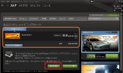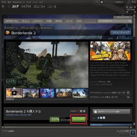 「ストア」から「Borderland2」を探して「カートに入れる」をクリック