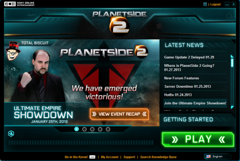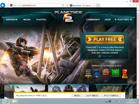 Planetside 2の公式サイト(PlanetSide 2 PC Game - Massive Combat on an Epic Scale)からセットアッププログラムをダウンロードします。現在はトップページの左下(Download the Game)またはPLAY FREE(ログインしていない場合はアカウント作成ページに移動します)からダウンロードできます。またSteam(Steam へようこそ)に登録されているのでそちらでインストールを行う事もできます。
