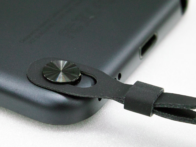 正式にはiPod touchループというのでしょうか、背面左下の丸い部分を押すと、フックが出っ張ります。もう一度押すと元に戻る仕組みです。このフックが出た状態で、iPod touchループのダルマ穴をフックに引っ掛ければ完成です。簡単ですがちょっと不安な感じがします。。。